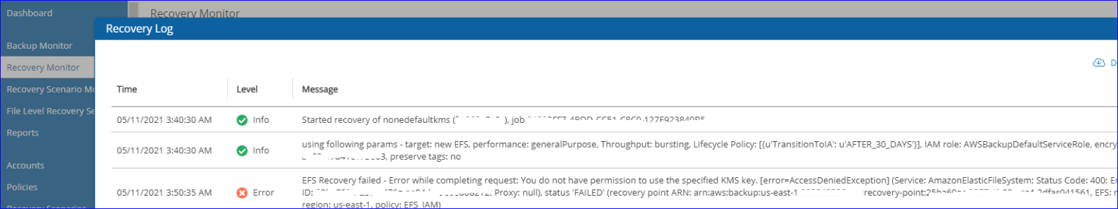 EFS Recovery failed - You do not have permission to use the specified KMS key