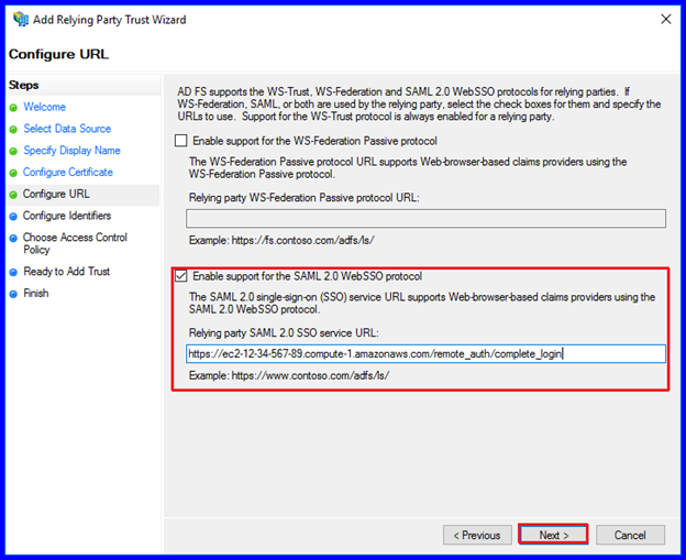, Select the Enable support for SAML 2.0 WebSSO protocol check