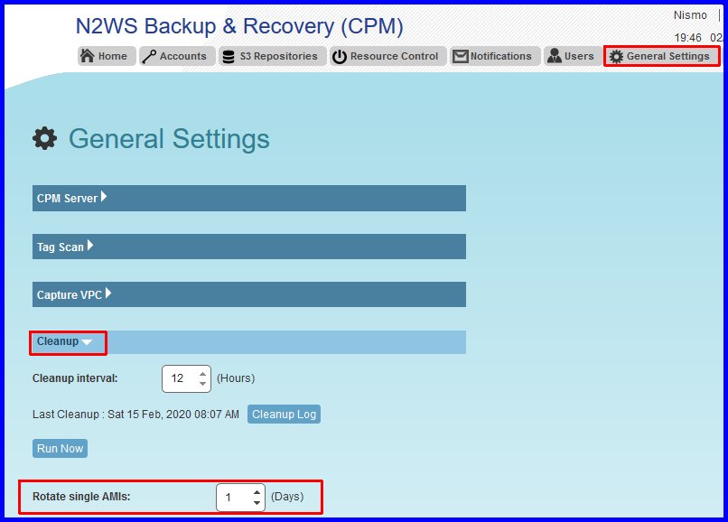 To configure AMI rotation to take place on every backup, login to the CPM UI and go to General Settings , expand "Cleanup" and then set the AMI Rotation to 1 day , as illustrated below.
